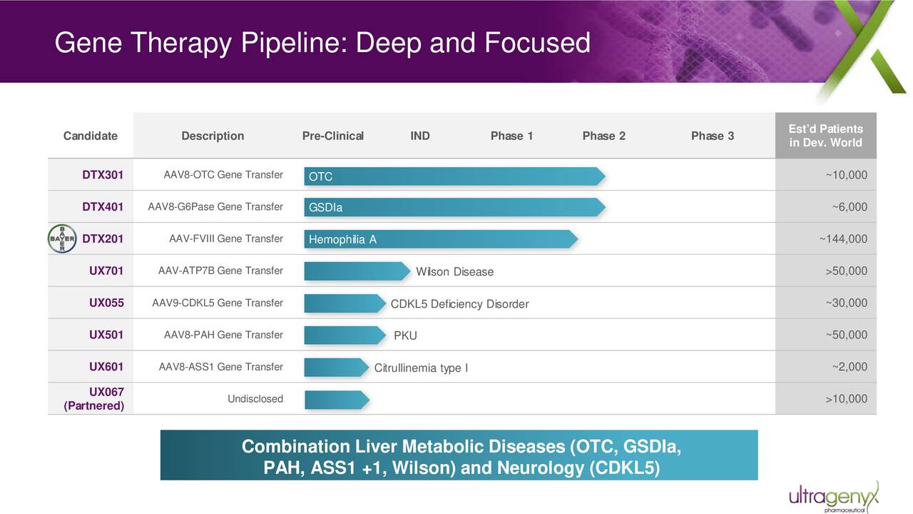 Ultragenyx是一家专注于遗传性罕见病或超罕见疾病基因治疗的生物制药公司,该公司成立于2010年,目前已建立多元化的产品开发组合,旨在解决那些未被满足的、生物学机制明确的疾病疗法开发。公司由一支在罕见病治疗开发和商业化方面经验丰富的管理团队领导,在基因治疗领域的合作伙伴包括REGENXBIO Inc.(开发用于治疗A型血友病、B型血友病等罕见病方面的产品)、Bayer(开发A型血友病方面的基因治疗产品)。