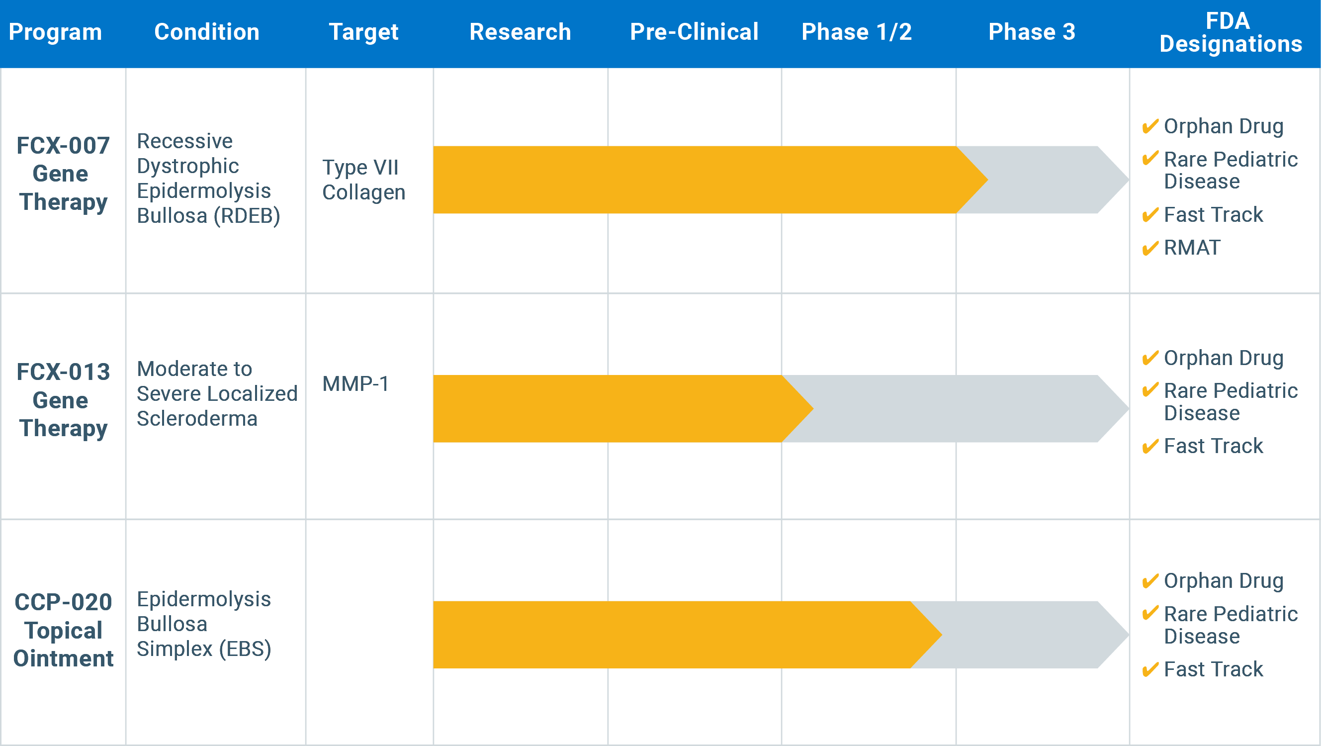 Castle Creek Biosciences是一家致力于为罕见遗传性疾病开发基因治疗孤儿药的公司,于2019年由Castle Creek Pharmaceuticals和Fibrocell Science合并成立。主要产品针对隐性营养不良性大疱性表皮松解症(RDEB),同时包括针对中至重度硬皮症(Scleroderma)、单纯大疱性表皮松解(epidermolysis bullosa simplex,EBS)等遗传性皮肤疾病开展基因和细胞治疗