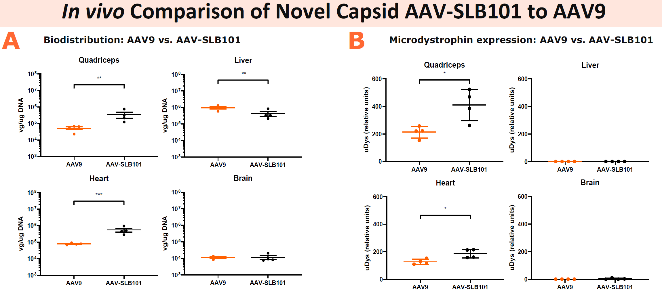 此外,在此次线上会议中,Solid Biosciences研发部门资深科学家Jennifer Green博士通过线上海报的形式展示了他们全新用于肌肉组织基因传递的新型AAV载体。他们设计出一套全新AAV血清型,用于提高DMD治疗中的病毒肌肉组织嗜性和转导效率。主要发现如下: