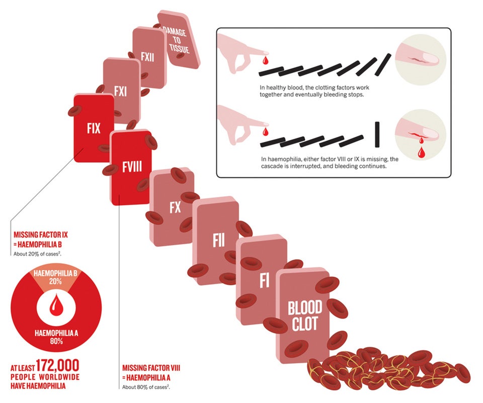 A型血友病是一种遗传性疾病,但已知病例中约有三分之一是由自发的基因突变引起的,超过一半的A型血友病患者病情严重。A型血友病的遗传信息由X染色体携带,以X连锁的隐性方式遗传疾病。因此,女性必须遗传两条携带血友病突变基因的X染色体才会患病,而男性只要携带一条有问题的X染色体即患病。