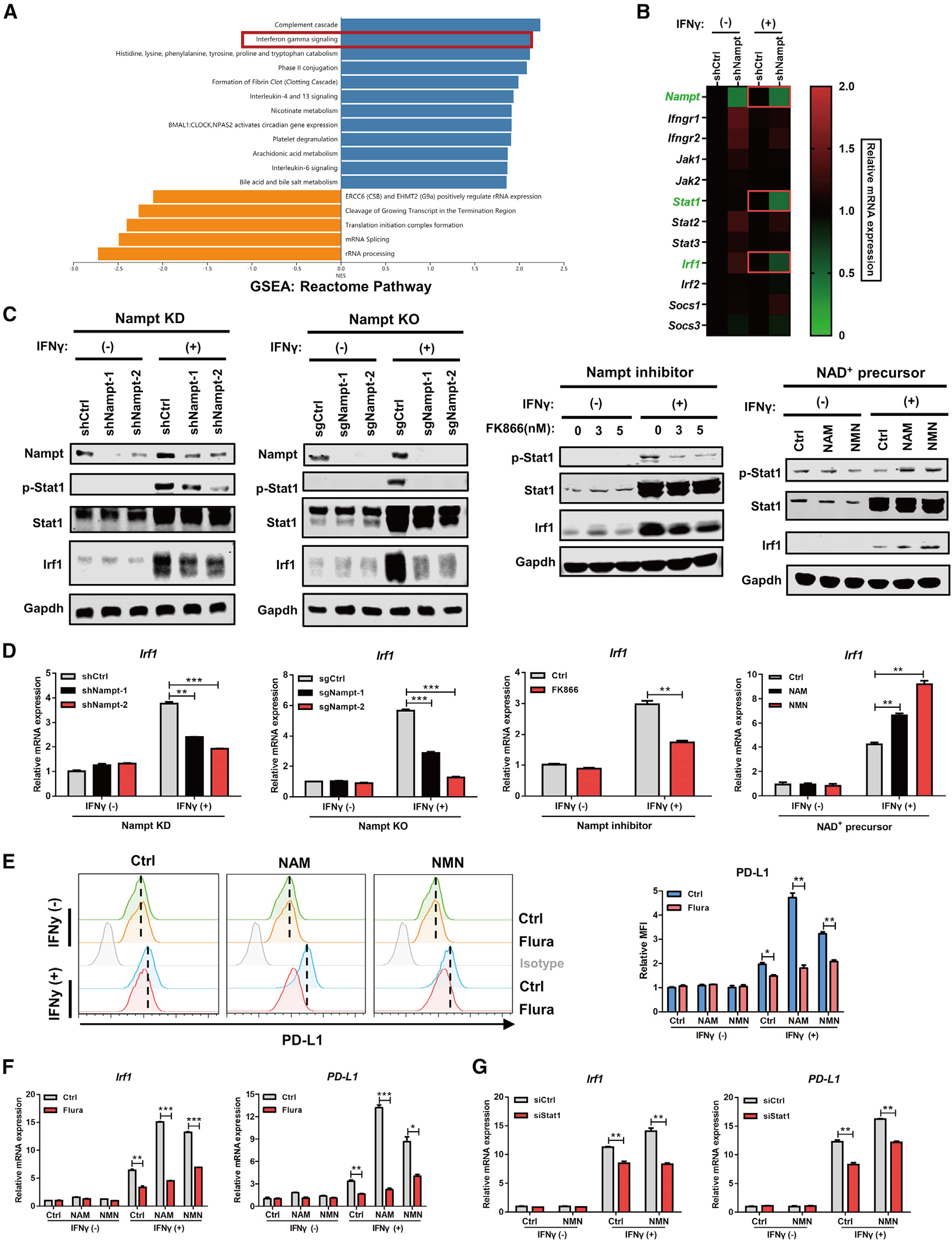 烟酰胺腺嘌呤二核苷酸(NAD+)是能量代谢和信号转导途径的重要中介[1],除了在氧化磷酸化和氧化还原反应中的功能外,NAD+还作为许多酶的底物,并参与许多生物过程,如DNA修复、炎症和蛋白质乙酰化[2]。烟酰胺磷酸核糖基转移酶(NAMPT)是NAD+合成途径的限速酶,NAMPT和NAD+在几种人类恶性肿瘤中经常上调,并在肿瘤的起始、进展和复发中发挥关键作用[3]。然而,NAMPT介导的NAD+代谢在调控肿瘤免疫逃逸中的作用尚不清楚。