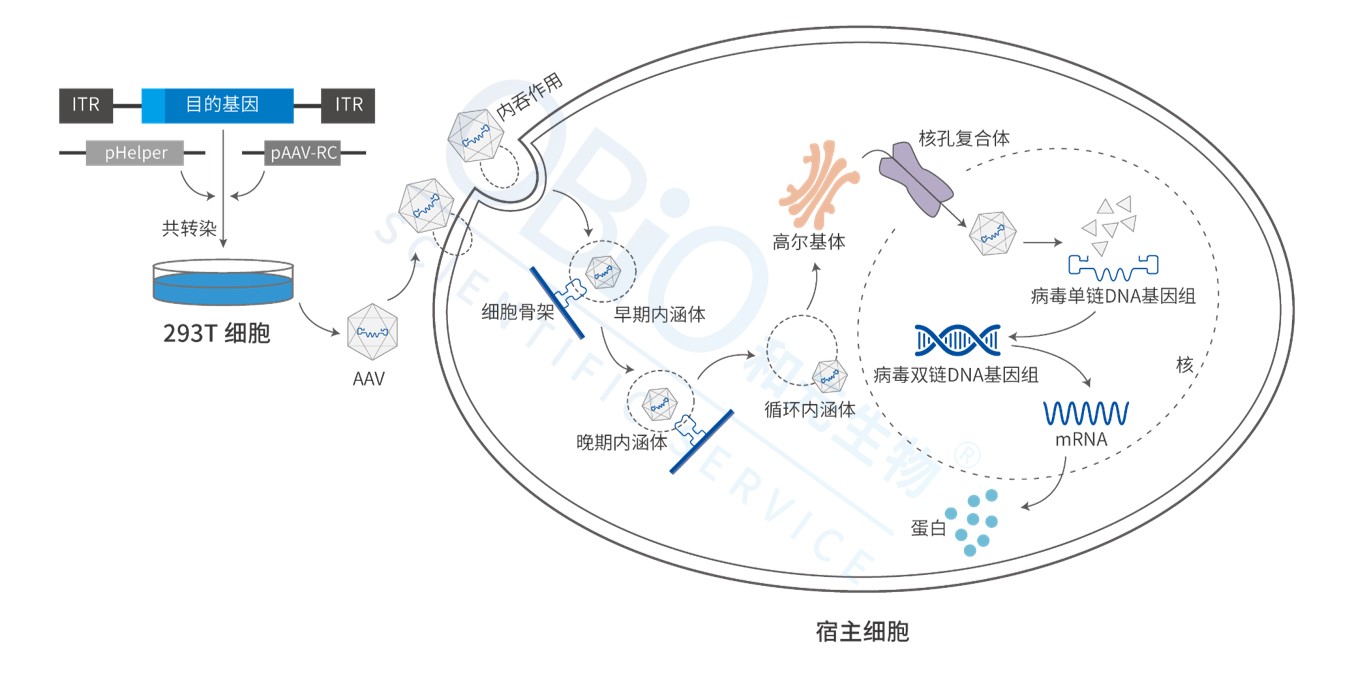 ◆纯化后的AAV病毒载体可以用于侵染细胞,侵染细胞时,AAV与细胞表面特异性受体结合,激活胞内信号通路,进而触发AAV通过受体介导的内吞作用进入细胞,在核内体、高尔基体等细胞器的协助下进入细胞核,随后病毒裂解,其单链DNA复制成为双链DNA后表达目的基因。