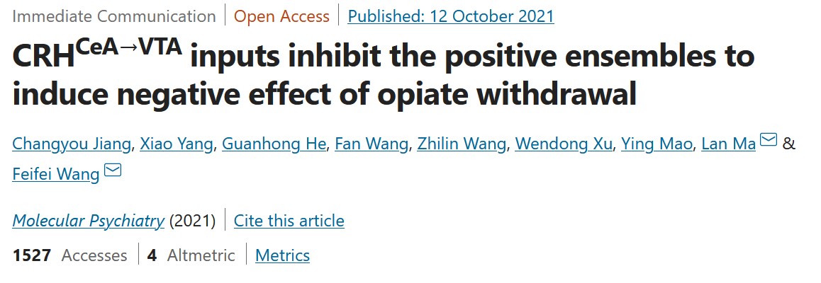 [3]Changyou Jiang, Xiao Yang, et al. CRHCeA→VTAinputs inhibit the positive ensembles to induce negative affect of opiate withdrawal. Mol Psychiatry. 2021 Oct 12.doi: 10.1038/s41380-021-01321-9.