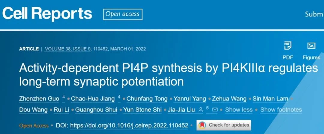 中国科学院遗传与发育生物学研究所刘佳佳研究员团队借助脂质组学、活细胞成像、细胞生物学技术、RNAi(RNA干扰)技术、全细胞膜片钳记录、行为学范式等多个技术手段发现位于兴奋性神经元树突胞膜上PI4P的代谢调控在活动依赖的AMPAR膜转运过程中以及在LTP和学习记忆中发挥重要作用,并揭示了活动诱导的细胞内钙离子浓度上升促进了PI4KIIIa向细胞膜表面募集,进而促进PI4P的合成过程。相关研究成果于2022年3月1日刊发在《Cell Reports》上,标题为“Activity-dependent PI4P synthesis by PI4KIIIα regulates long-term synaptic potentiation”。