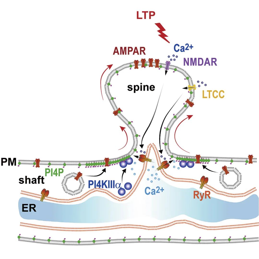 随后,研究人员进一步发现CICR(钙诱导的钙释放)促进了PI4KIIIa在LTP期间从细胞质到细胞膜表面募集,进而介导了PI4P的合成,促进AMPAR亚基GluA1在细胞膜上的运输(图4)。