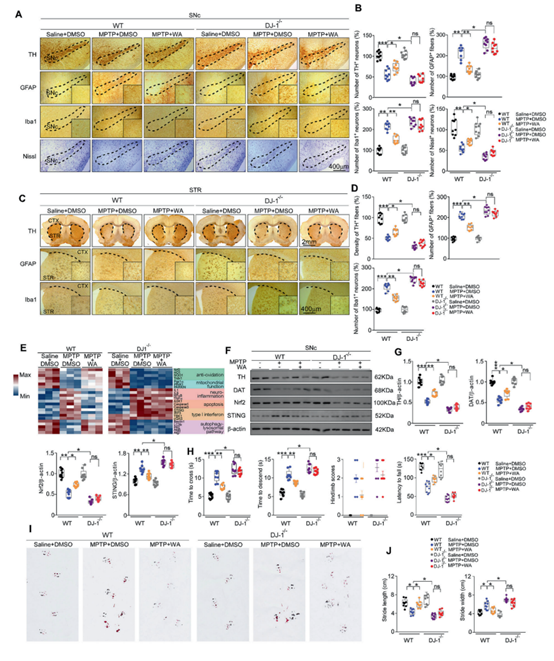 为了验证WA在帕金森病中发挥神经保护作用,研究者首先在MPTP诱导的帕金森小鼠模型中分别腹腔给予WA(或对照)处理。通过多种组织学和蛋白质印迹检测,发现相比给予溶剂对照,WA处理可以显著抑制帕金森模型鼠黑质-纹状体通路中多巴胺神经元的丢失。转棒、爬杆等行为学实验的结果表明,WA处理可以显著减轻帕金森模型动物的运动障碍症状(图1)。