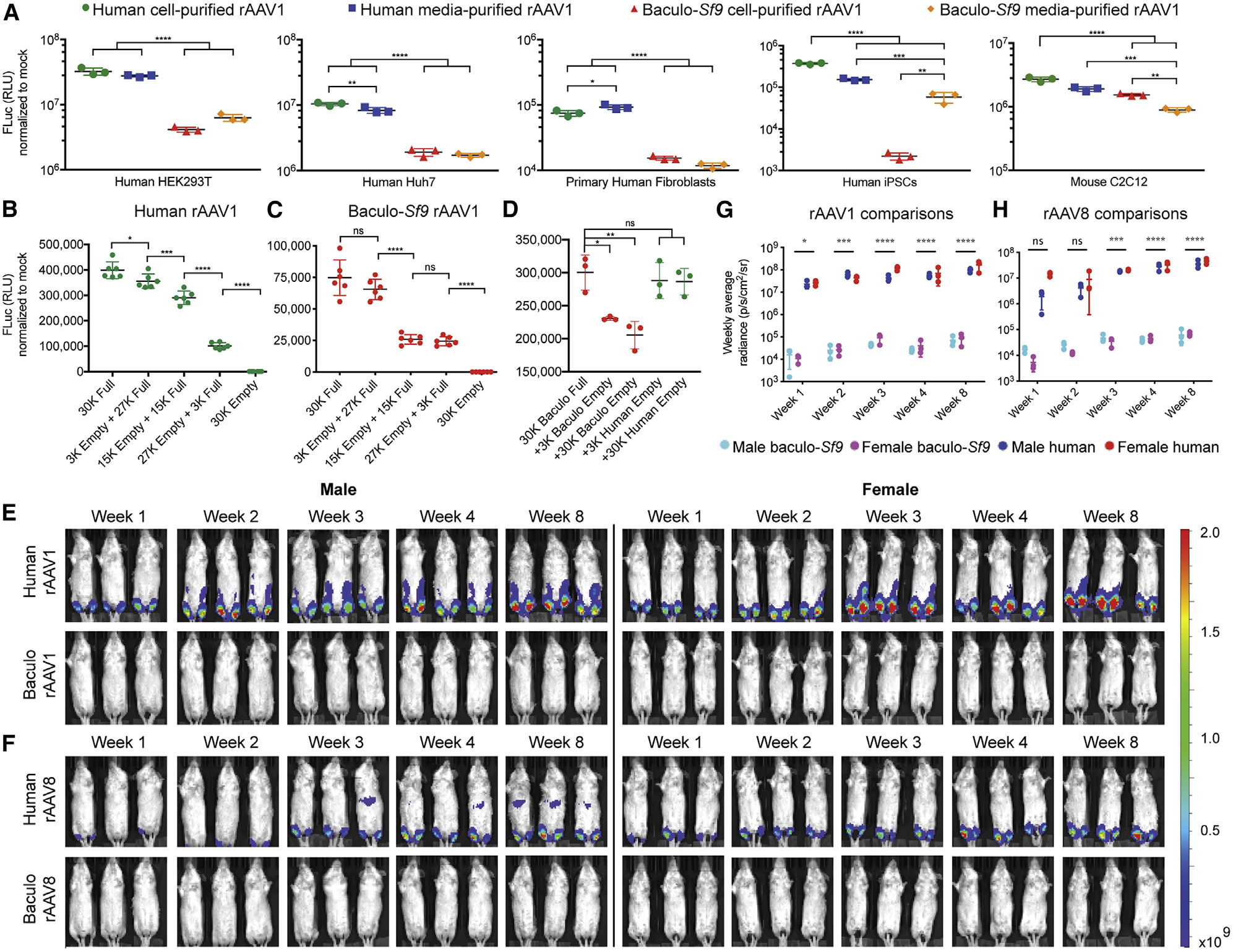 因此,从这些数据展示可以看到,基于293细胞生产的rAAV可能比Sf9有更好的感染效率、更高的质量,也更有临床应用的潜力。当然,不可否认的是,Sf9系统rAAV包装体系具有更高的rAAV包装产率,假以时日,解决上述问题的Sf9包装系统亦有潜力成为基因治疗载体生产的重要力量。