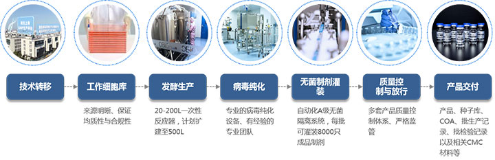 GMP质粒和病毒生产平台可提供基因治疗临床样品及商业化GMP生产,严格按照多国家法规监管要求,依据GMP规范进行生产及质量控制。平台采用大规模一次性生产技术进行质粒和重组病毒的生产,由GE医疗提供灵活工厂(FlexFactoryTM),其余辅助设备均采用国际一流品牌。生产的临床级质粒和重组病毒载体纯度及稳定性高,满足基因治疗临床样本及GMP生产的法规监管和新药申报要求。