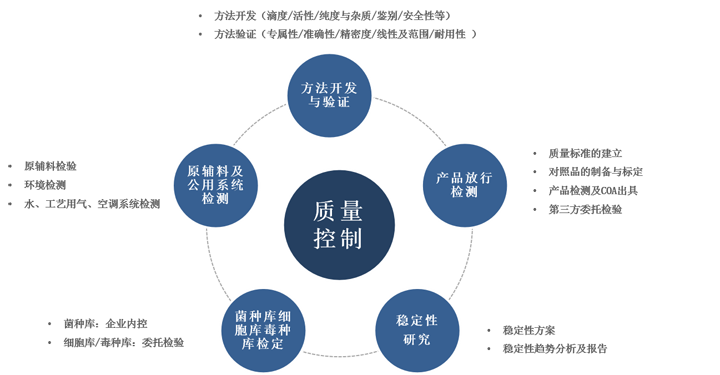 基于平台完善的质量管理体系,产品的不同理化特性,建立了针对不同产品的质量控制方法,近30项质量检测报告,实行全面过程控制和药物质量放行管理,质量体系建设贯穿QC检验的始终。