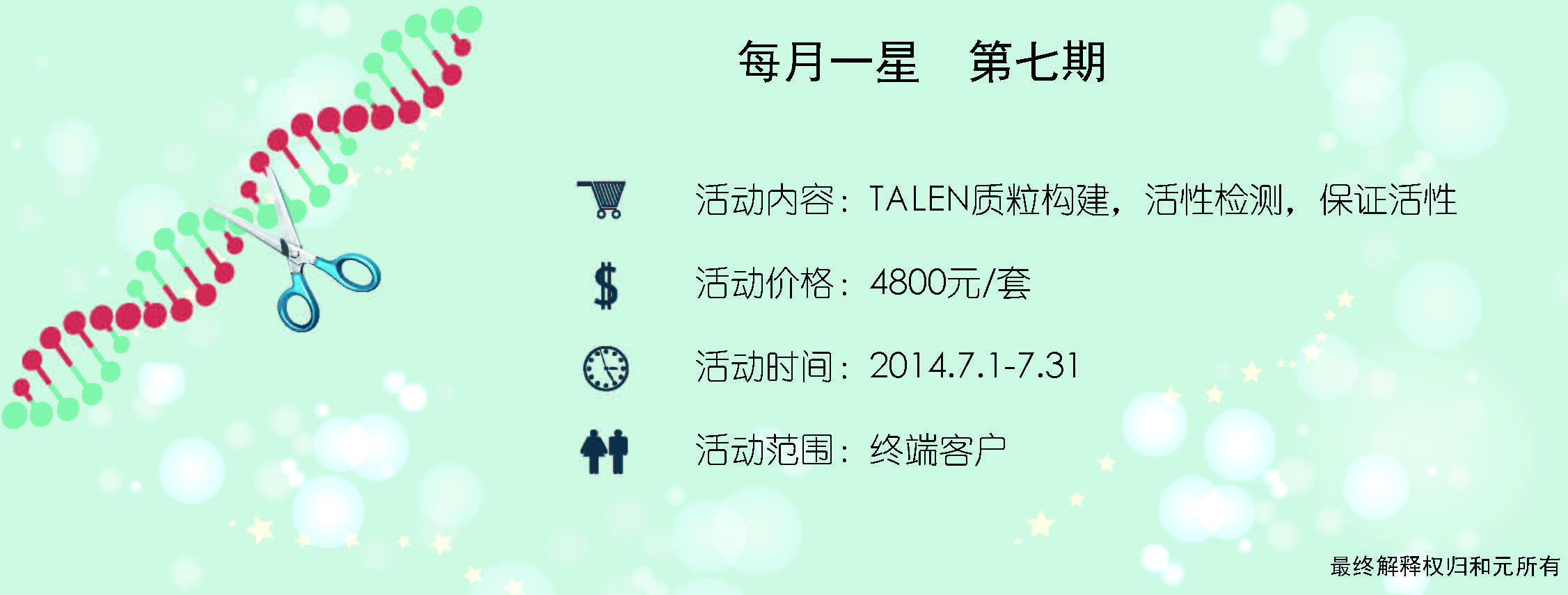 活动内容:感恩回馈,七月促销!千亿国际入口&纽恩“每月一星”活动,七月份为您献上TALENs质粒构建、活性检测优惠套装。敲除利润,拒绝暴利!