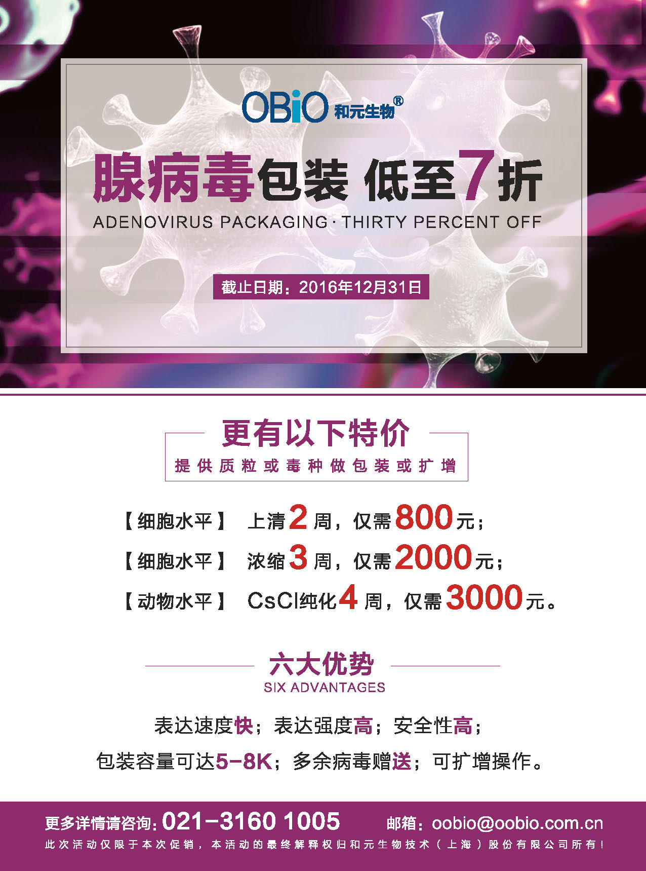 继慢病毒包装和预付款促销之后,腺病毒促销同样有很大的吸引力哦。腺病毒包装,低至7折。前所未有的冰点促销,你心动了吗?这次错过了,可能不会再有下一次了!