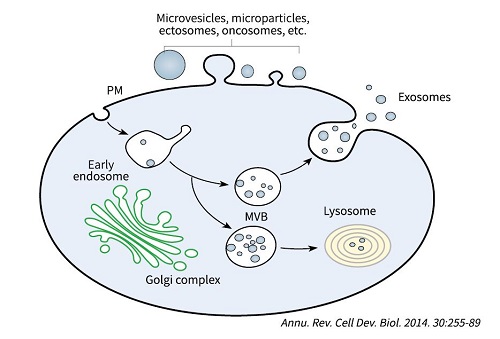 根据来源,EV可以分为不同的亚型,其中主要包括凋亡细胞体(1000-5000nm)、外泌体(70-160nm)与微囊泡(100-1000nm)。外泌体来源于细胞核内体系统,由多囊泡体内陷腔化形成并通过多囊泡体与细胞膜融合而释放到细胞外环境中。1983年,研究人员第一次发现外泌体的释放,但直到人们发现外泌体中包含着miRNA在内的small RNA,外泌体成为科学研究的热点之一。