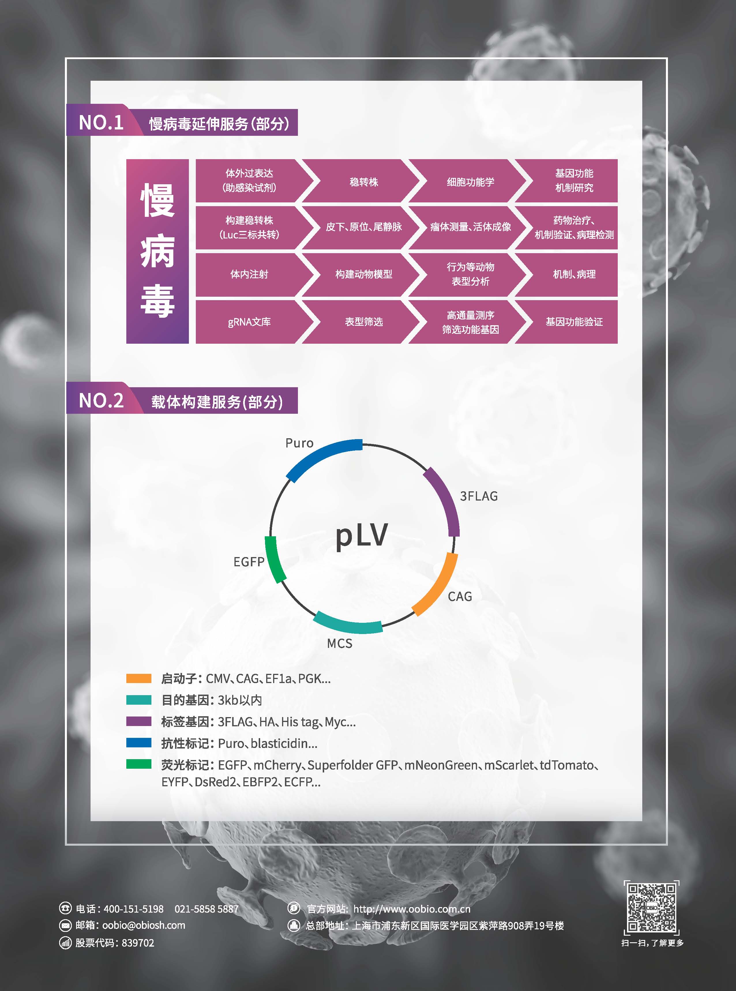 慢病毒载体(Lentivirus)是一类改造自人免疫缺陷病毒( H I V )的病毒载体,基因组为RNA,对分裂细胞和非分裂细胞均具有感染能力,具有宿主范围广、基因容量大、可以长期表达等特点,广泛应用于肿瘤研究等领域。