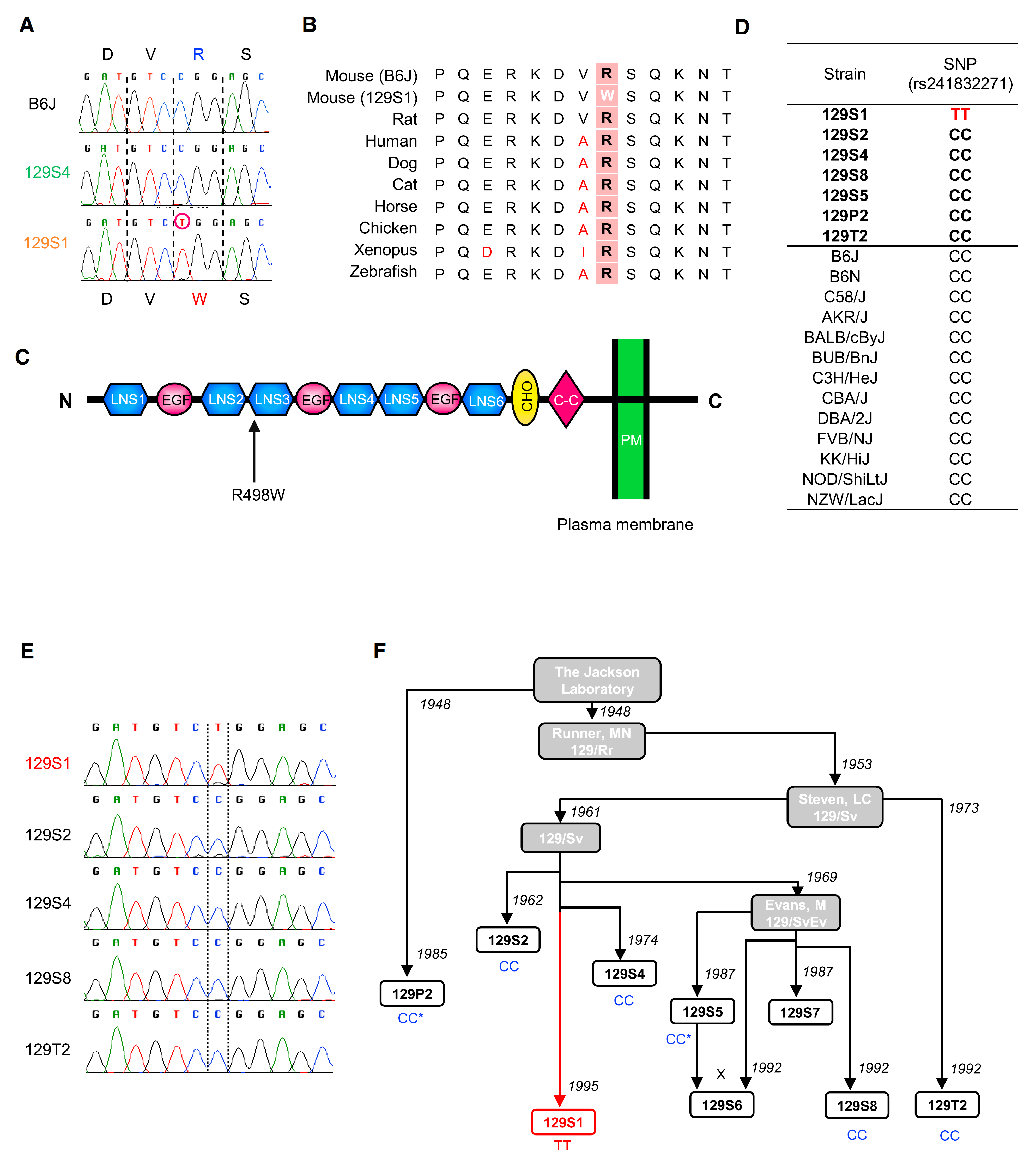 接下来,作者通过基因测序以及序列比对方法研究129S1有哪些特异性突变,发现在所有突变体中,只有129S1突变体第12条染色体上第89254694对碱基的C突变成T,此位置在Nrxn3基因的第6个外显子上。这一突变导致498位的精氨酸(R)突变为色氨酸(W),称为R498W突变。同样地,R498W突变也只出现在129S1中(图2)。