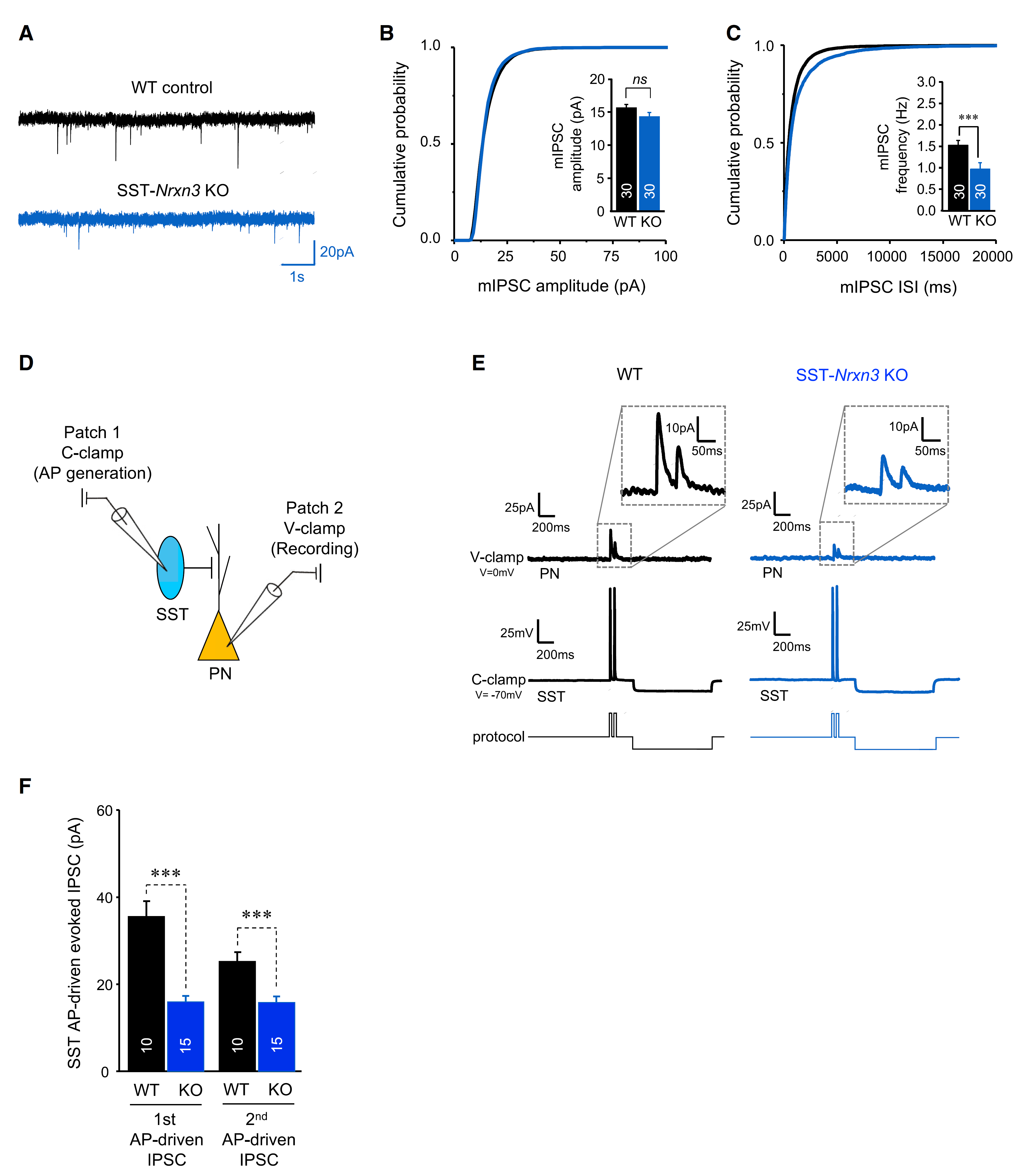 接下来,作者希望了解SST神经元中敲除Nrxn3基因对其电生理性质的影响。首先,他们使用膜片钳电生理方法记录ACC中椎体神经元,发现敲除Nrxn3基因后,ACC锥体神经元接受的mIPSC频率降低,幅度不变(图5A-C)。然后,他们同时记录SST神经元与椎体神经元,发现敲除Nrxn3基因后,刺激SST神经元诱发的IPSC幅度显著降低(图5D-F),表明Nrxn3基因参与SST神经元GABA的传递。