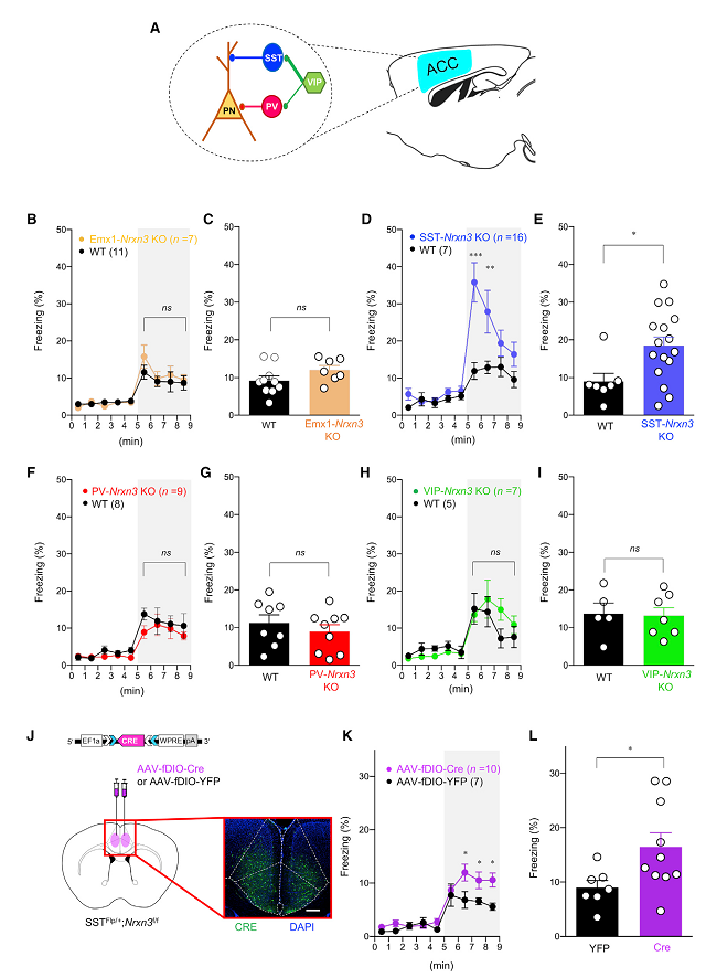 过去的研究表明,ACC脑区参与恐惧共情反应。而ACC中包含兴奋性椎体神经元以及抑制性神经元(图4A)。为探究参与恐惧共情反应的神经元细胞类型,作者分别在兴奋性神经元(Emx1)以及3种抑制性神经元(SST, PV, VIP)中条件敲除Nrxn3基因,发现只有SST神经元中敲除Nrxn3基因的小鼠的恐惧共情反应水平显著提升(图4B-I)。