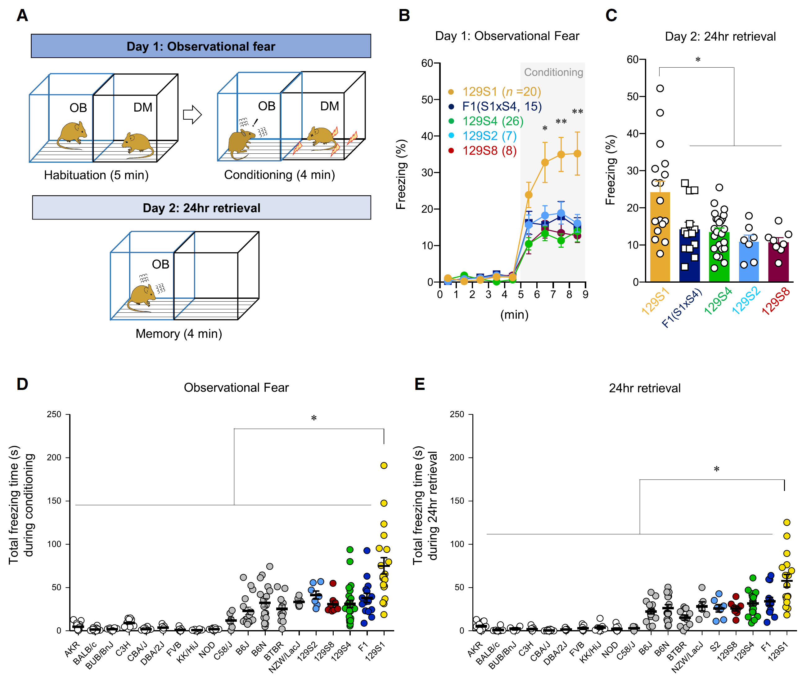 在恐惧共情范式中,当一只小鼠受到足底电击,观察到此现象的另一只小鼠会产生恐惧反应,称之为恐惧共情。恐惧共情反应可维持24小时以上(图1A)。为探究恐惧共情的神经机制,作者使用了一系列突变体小鼠,发现129S1品系恐惧共情反应程度最高(图1B-E)。