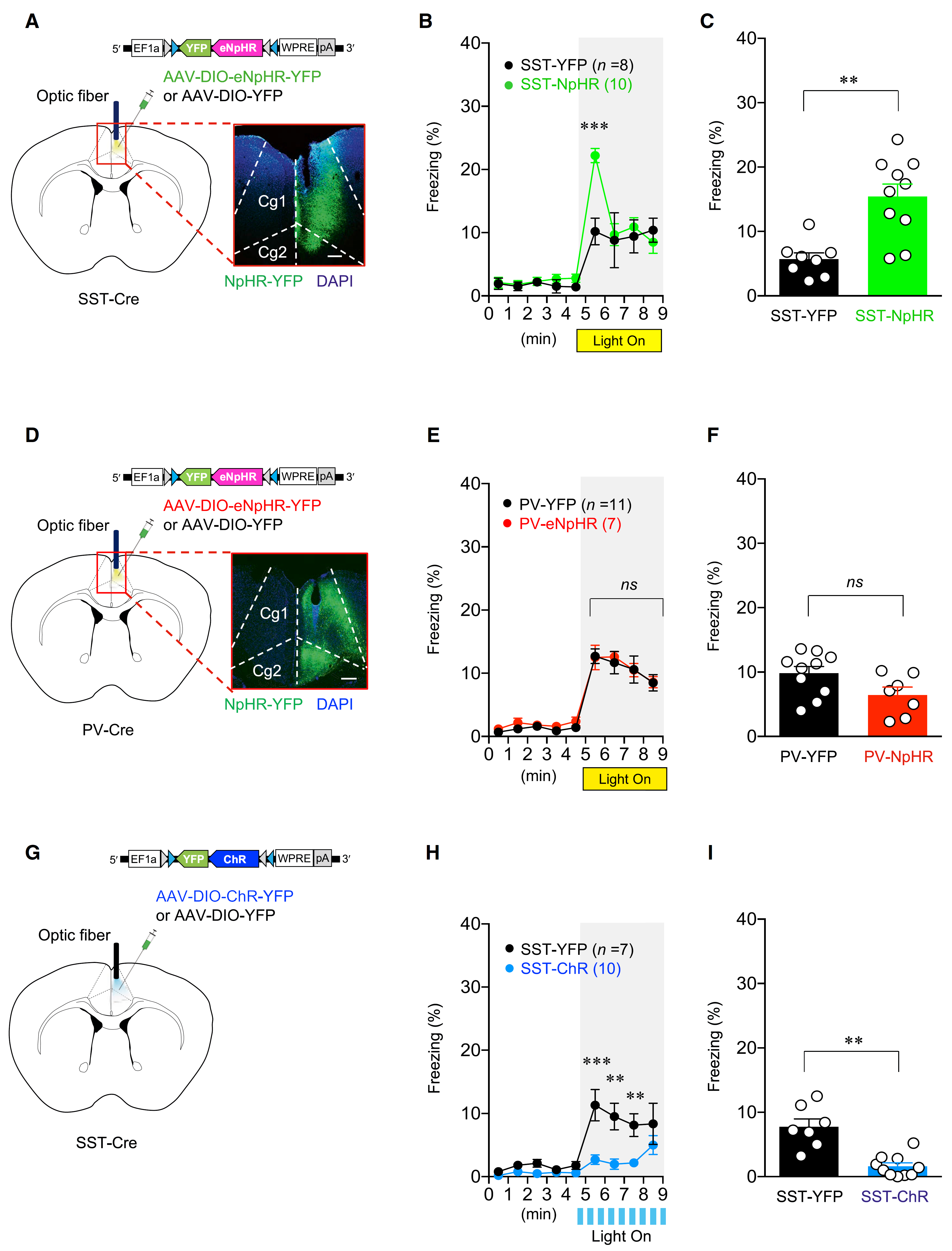 最后,作者通过光遗传方法验证ACC脑区SST神经元在恐惧共情中的重要性。他们在SST-Cre小鼠的ACC中注射AAV-DIO-eNpHR或AAV-DIO-ChR2,发现光抑制SST神经元可提高恐惧共情反应水平;光激活SST神经元会降低恐惧共情反应水平,而光抑制PV神经元则不会有任何影响(图6)。