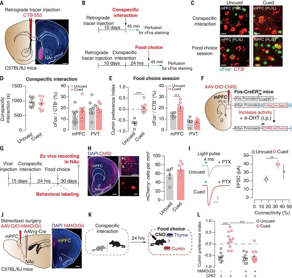 为研究投射到NAc的mPFC神经元是否参与STFP,作者在小鼠NAc注射逆行示踪染料CTB-555,并使之与食用过孜然味食物的小鼠社交,24小时后使其在两种味道的食物中做出决策(图1A-B)。他们发现小鼠倾向于孜然味食物且mPFC中被激活的CTB阳性神经元数量显著增加,而社交行为与社交行为激活的CTB阳性神经元数量无差异(图1C-E)。