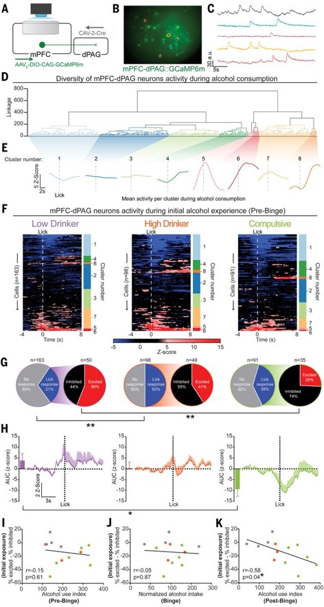 为验证此推测,作者引入钙成像方法[10]。他们在小鼠的dPAG注射CAV2-Cre,在mPFC注射AAV-DIO-GCaMP6m,通过梯度折射率透镜与显微内窥镜检测mPFC-dPAG神经元的钙信号变化(图2A-C)。他们采用分层聚类方法将352个mPFC-dPAG神经元进行聚类,并将其分为8个集群(图2D-E)。他们发现,初次接触酒精时,强迫性酗酒鼠中更高比率的mPFC-dPAG神经元被抑制;而饮酒时,低饮酒鼠的mPFC-dPAG神经元表现出更高的激活水平(图2F-H)。他们还发现,初次接触酒精时,小鼠被激活或抑制的mPFC-dPAG神经元的占比与小鼠的饮酒量之间在狂饮后阶段呈负相关,而在其它两个阶段无相关性(图2I-K)。