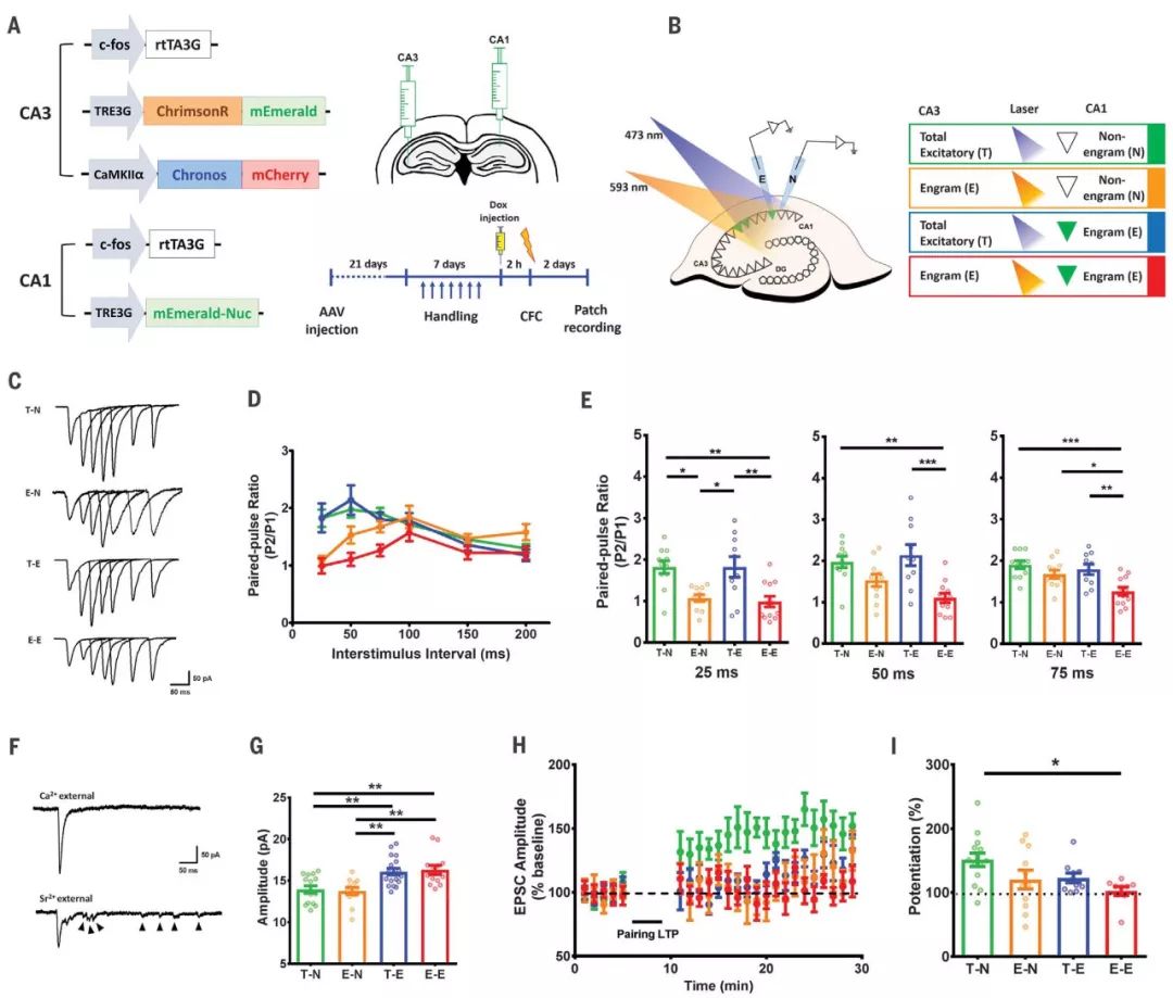他们使用Fos-rtTA系统配合AAV-TRE3G-ChrimsonR病毒标记CA3印迹细胞(E),用AAV-CaMKIIα-Chronos标记CA3全部兴奋性神经元(T)。又用Fos-rtTA配合AAV-TRE3G-mEmerald病毒标记CA1印迹细胞,并在场景条件恐惧行为实验之后,全细胞记录小鼠CA1印迹细胞(E)或非印迹细胞(N)。表达ChrimsonR的神经元可被黄光激活,表达Chronos的神经元可被蓝光激活(图4A-B)。