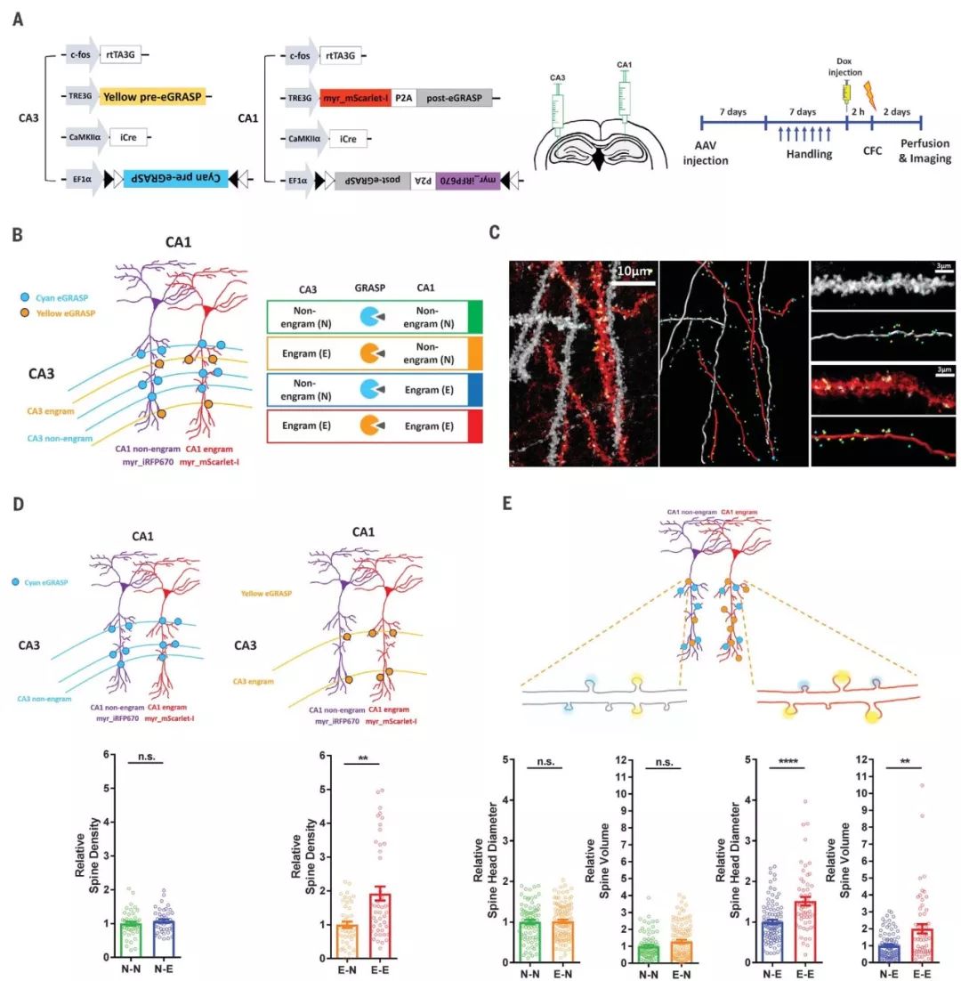 结合Fos-TRE系统[3],作者使用上述dual-eGRASP技术研究记忆存储的突触位置。他们在对侧CA3注射AAV-c-Fos-rtTA3G和AAV-TRE3G-黄色pre-eGRASP,因为只有被激活的神经元可以启动c-Fos元件,因此只有CA3印迹细胞(E)可表达黄色pre-eGRASP;他们在同侧CA3中注射少量AAV-Cre和大量AAV-DIO-青色pre-eGRASP,以随机标记CA3神经元,轴突末端表达青色不表达黄色荧光的即非印迹细胞(N)。又用Fos-TRE系统与红色荧光蛋白标记同侧CA1印迹细胞(E),用少量AAV-Cre和大量AAV-DIO-紫色荧光蛋白随机标记CA1神经元,CA1紫色非红色神经元即非印迹细胞(N)(图2A-B)。