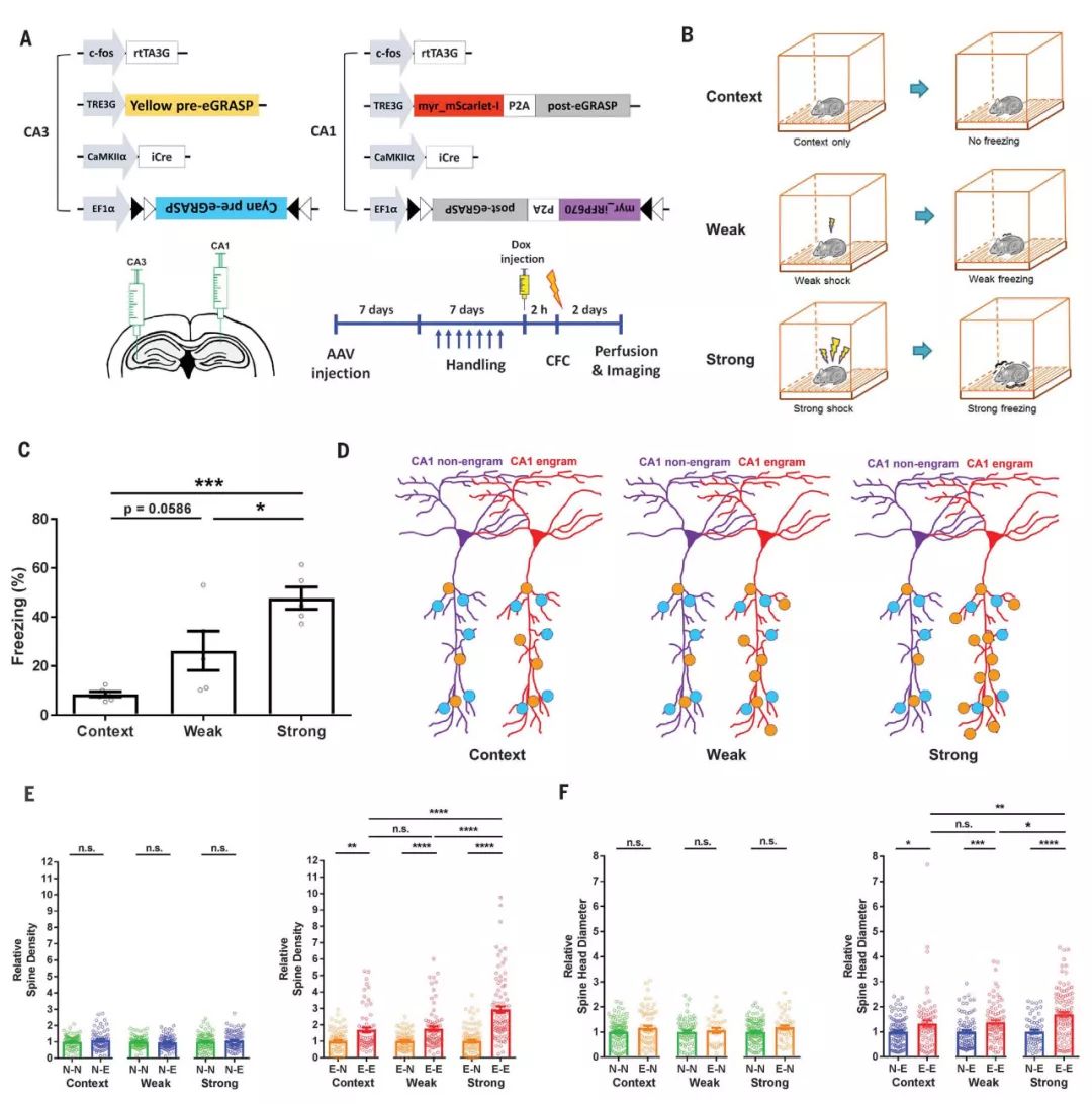 通过观察,他们惊喜地发现,小鼠在场景条件恐惧实验之后,其CA3到CA1的E-E突触密度显著增加,树突棘数量增加,体积更大。而N-N、E-N、N-E之间的突触无明显变化(图2C-E)。