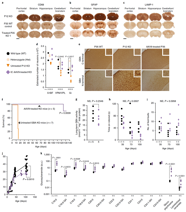 当他们使用同样的策略,将携带GBA基因的治疗性AAV病毒载体注射到nGD模型胎鼠脑之后,他们惊喜地发现接受治疗的鼠在出生后35天时,炎症和胶质细胞化程度与野生对照鼠无异(图7a-b),神经元丢失现象显著降低(图7d),存活周期极显著增长(超过120天)(图7f),GCase的活性与对照组无异,行为学也得到显著改善(图7)。总之,nGD的症状得到全方位缓解。