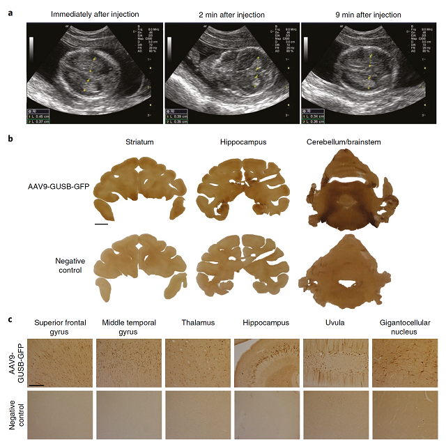 既然出生前胚胎期基因治疗是最有效的方式,作者最后测试胚胎期非人灵长类动物脑室注射AAV病毒的基因递送方法及效果。通过超声引导的病毒注射,他们成功将6.6*1012总量的scAAV-GUSB-GFP注射到侧脑室内。该操作不影响猕猴的正常出生、发育,且猕猴的脑中成功表达了GFP荧光蛋白(图9)。