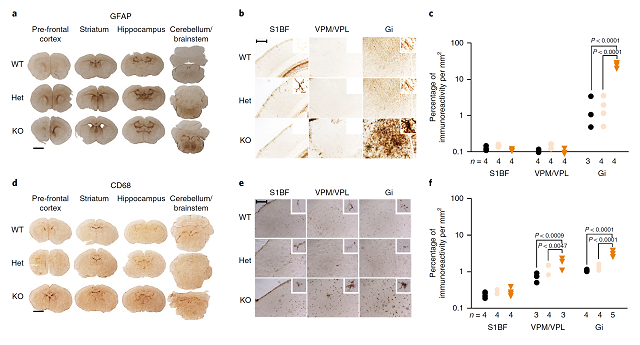 通过对初生nGD小鼠脑进行的免疫组化实验,作者检测了活化小胶质细胞和星形胶质细胞标志物CD68和GFAP表达量,发现出生后1天的nGD鼠神经炎症反应和胶质细胞化程度已显著增强(图3)。同时,在nGD小鼠出生后不同天数,神经元逐渐大量丢失(图4)。