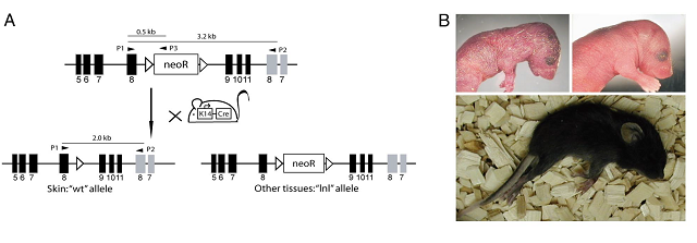 为了研究该类疾病,作者使用过去报道过的一种戈谢病疾病模型鼠(图2)[2],借助角化细胞特异性启动子K14,该类型nGD鼠只有皮肤的GBA酶表达正常,用来防止新生鼠皮肤脱水导致的死亡。该鼠的特点在于出生后15天内发生致死性的神经退行性疾病。