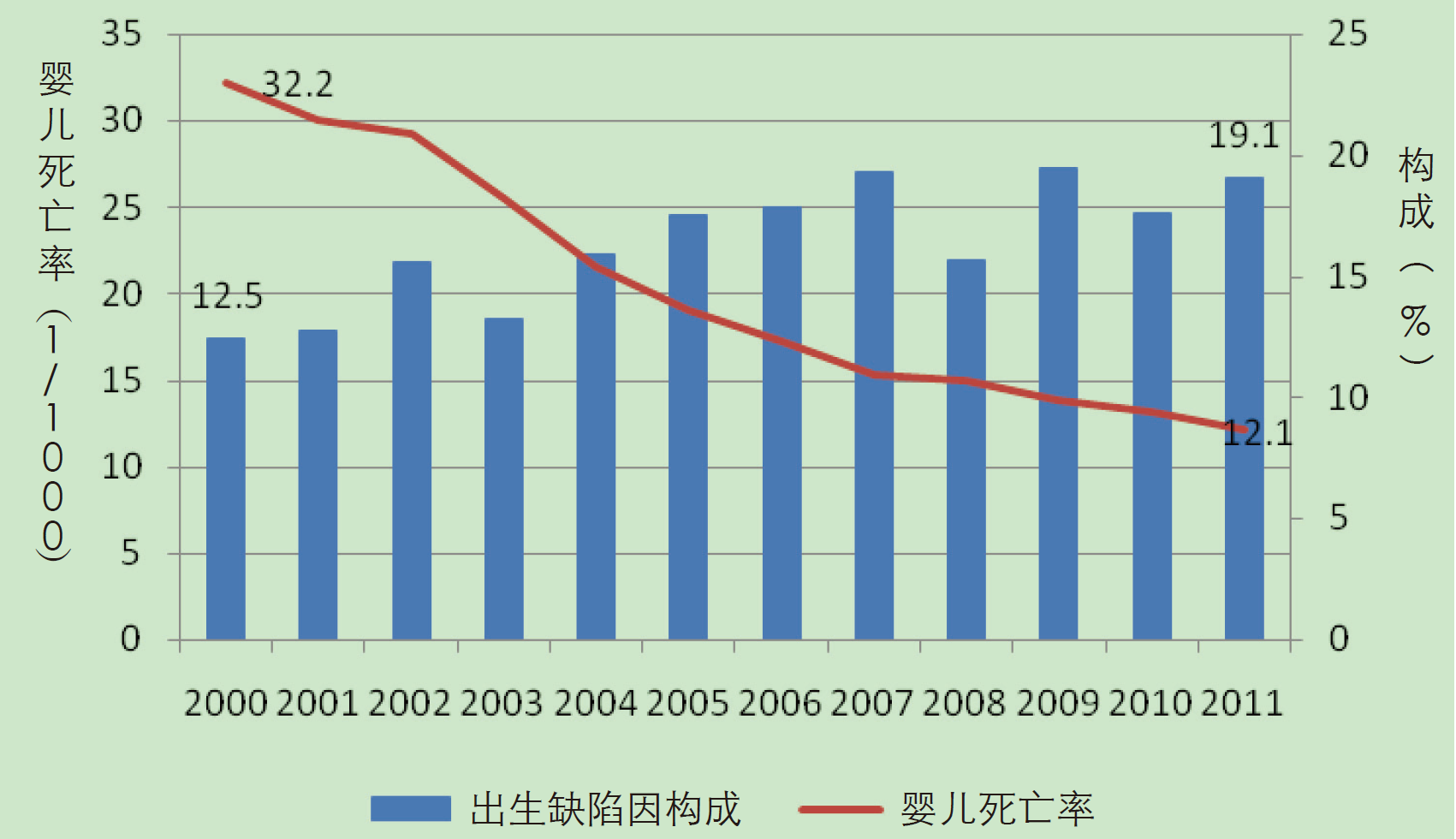2000-2011年全国婴儿死亡率趋势及出生缺陷死因构成变化