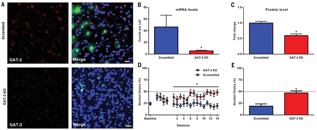 2018年6月22日,Science杂志刊登了瑞典Linköping大学M. Heilig研究组的最新工作[4],他们建立了一种新的行为学范式,让大鼠在酒精与甜水之间做出选择,筛选出了一些“酒鬼”鼠模型,并发现“酒鬼”鼠中央杏仁核(CeA)中γ-氨基丁酸转运体-3(GAT-3)表达量显著降低,敲除正常大鼠CeA中GAT-3会诱发其酒瘾。