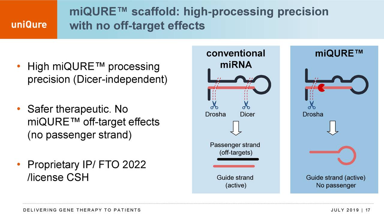 AMT-130是uniQue开发的、一种基于2/5型腺相关病毒(AAV2/5)的基因疗法,其携带有抑制突变亨廷顿蛋白(HTT蛋白)产生的microRNA。借助自身专利技术miQURE™沉默技术,uniQure利用AAV将microRNA递送至脑,对突变的HTT基因进行非选择性基因敲低,从而抵抗亨廷顿舞蹈症,这是一种极具创新和前景的新型基因疗法方法。该疗法已被美国食品和药物管理局(FDA)授予孤儿药地位和快速通道,并被欧洲药物管理局(European Medicines Agency)授予孤儿药称号。