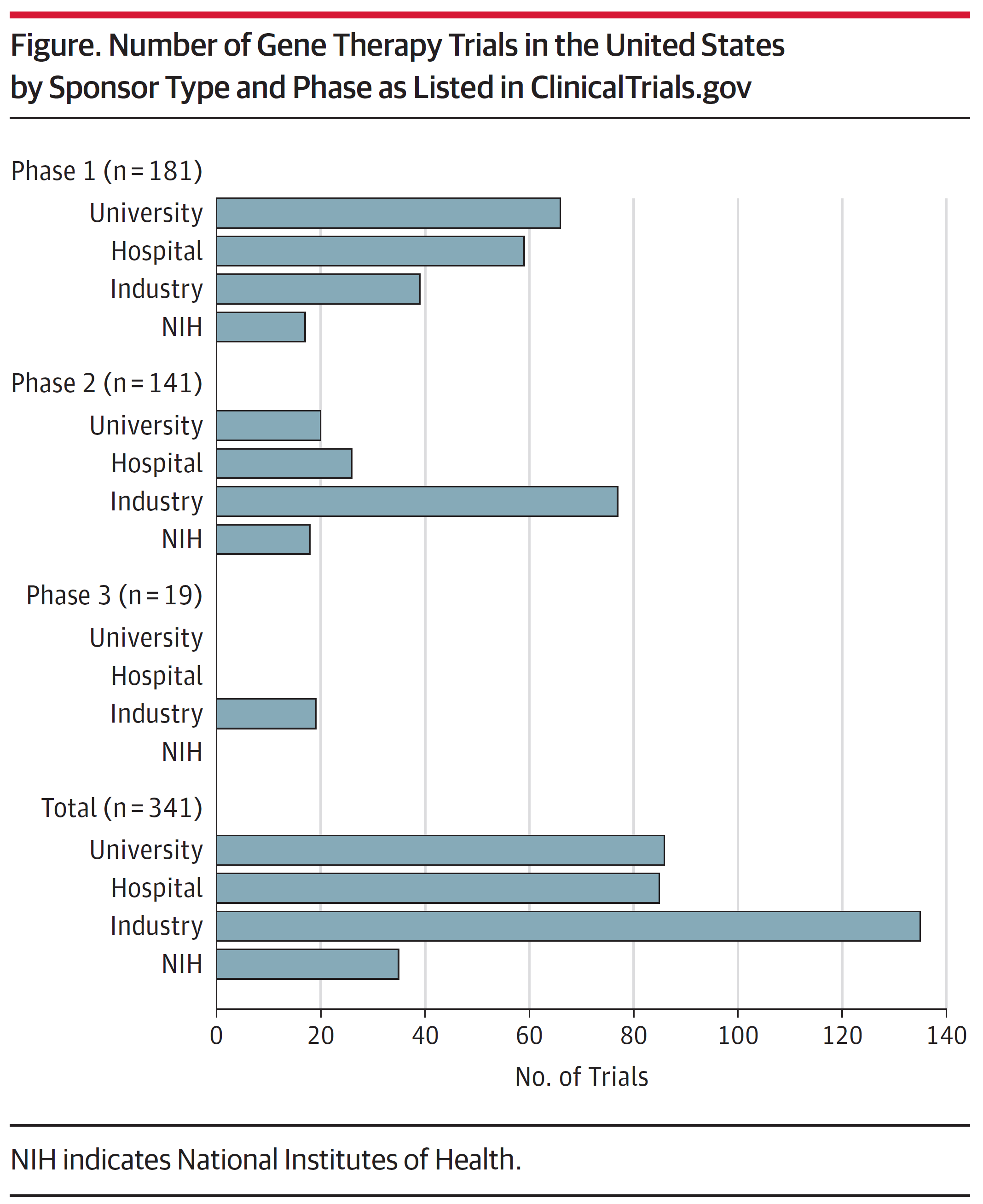 从统计中可以看到,在赞助(sponsorship)的项目中,35项临床试验由美国国家卫生研究院(NIH)赞助 (10%),135项临床试验由药企赞助(40%),85项临床试验由医院赞助(25%),86 项临床试验由大学赞助(25%)。在基金资助(funding)的项目中,NIH 提供了29%的项目基金,制药企业提供了46%的项目基金,学术界(医院和大学)提供了54%的项目基金(有重叠代表双重基金)。36%的基因治疗项目由药企单独资助,50%的项目由学术界或NIH单独资助。