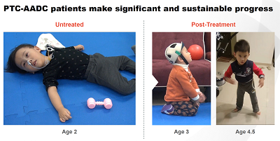 根据来自三个开放临床试验的数据分析报告显示,一次性使用PTC-AADC临床治疗的患者,在5年内显著降低了眼动危象(oculogyric crises,即眼睛不自觉地向上移动)的数量。同时,治疗也使孩子们的体重恢复,改善了他们坐、走和说话的能力,在接受治疗后,运动、语言和认知里程碑的益处可维持长达五年之久。这些试验共纳入了26名患有AADC缺乏症的儿童,他们的年龄从21个月到8.5岁不等,实验结果于2019年10月举行的第48届儿童神经学学会年会上报告。