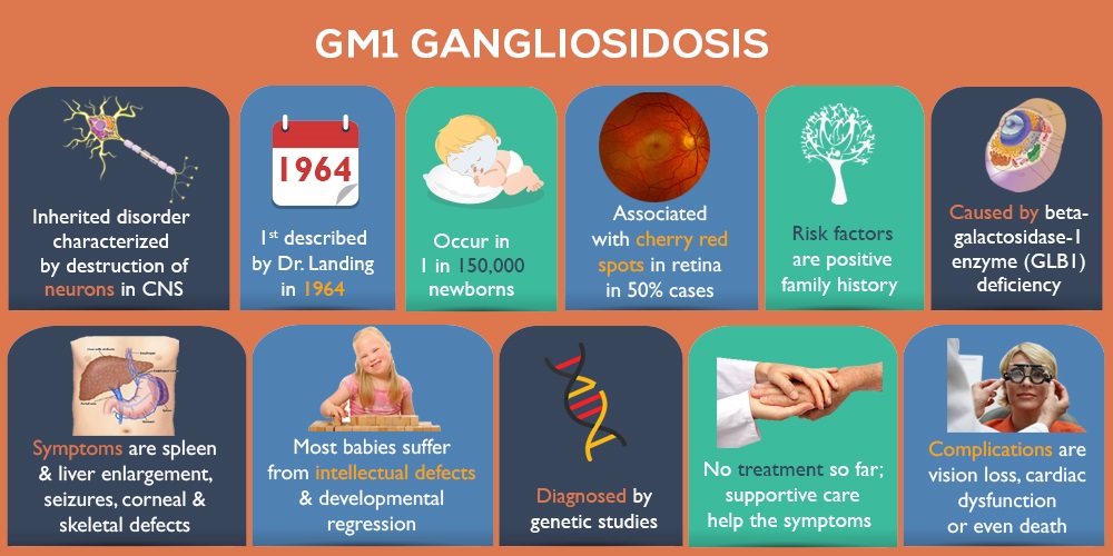 GM1神经节苷脂贮积症又称全身性神经节苷脂贮积症,是由β-半乳糖苷酶缺乏而引起的一种遗传性溶酶体疾病,其遗传方式为常染色体隐性遗传。临床特征为进行性中枢神经系统障碍及类似黏多糖贮积症Ⅰ型的骨骼异常。