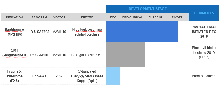 针对IIIA型粘多糖综合征的II/III期临床试验正在与Sarepta Therapeutics公司合作进行,GM1神经节苷脂贮积症的I/III期临床试验正在准备中。