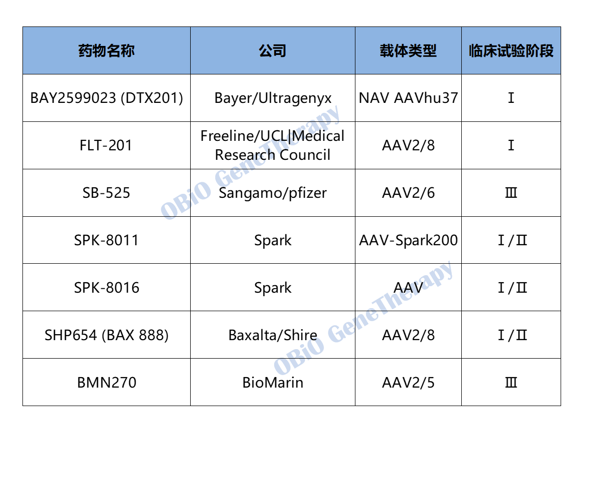 所有疗法均借助腺相关病毒载体完成,数款产品也已进入临床III期,我们有望快速看到A型血友病治疗方案上市应用,现就这些疗法中的代表案例进行简单介绍。