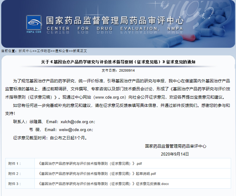 为了规范基因治疗产品的药学研究,统一评价标准,引导基因治疗产品的研究与申报,国家药品监督管理局药品审评中心在借鉴国内外基因治疗产品监管标准的基础上,通过前期调研、文件撰写、专家咨询以及部门技术委员会讨论,形成了《基因治疗产品药学研究与评价技术指导原则(征求意见稿)》。现通过中心网站(www.cde.org.cn)向社会公开征求意见,欢迎各界提出宝贵意见和建议。