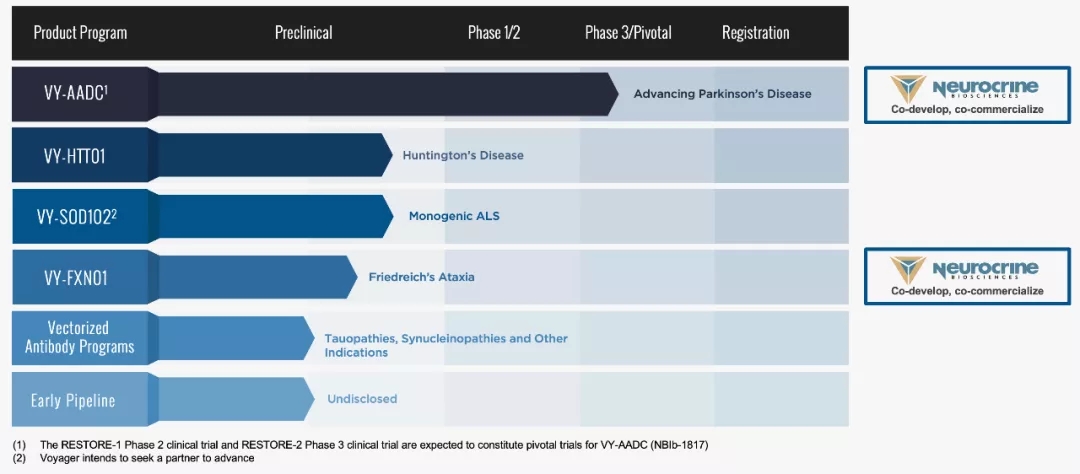 Voyager Therapeutics是一家临床阶段的基因治疗公司,致力于针对开发严重神经系统疾病的革命性疗法,通过对基因治疗载体优化,在制造,剂量和递送技术方面的创新和投资,来推动AAV基因治疗领域的不断发展。Voyager旗下拥有多条在研管线,主要包括帕金森症、亨廷顿舞蹈症等严重的神经系统疾病。尽管仍处于临床前阶段,基因治疗管线VY-HTT01被Voyager列在了全部管线的第二位,可见公司对该项目的投入与重视。