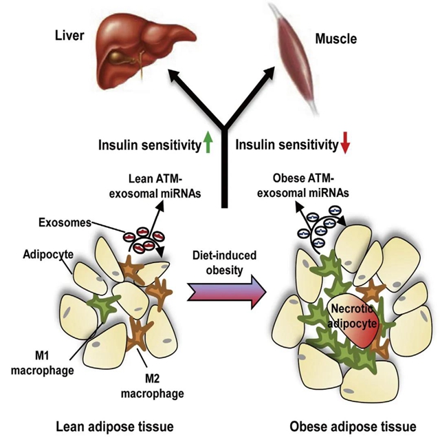胰岛素抵抗是导致2型糖尿病的一个重要原因。证据显示,肥胖是导致胰岛素抵抗的最常见的因素之一[1]。促炎巨噬细胞(M1)分泌的细胞因子TNF-α被认为是肥胖引起的组织炎症的一个原因[2]。利用TNF-α抗体使其与TNF-α结合,发现对胰岛素抵抗和糖代谢的症状改善有限。因此,科学家相信一定存在其他的巨噬细胞和免疫细胞因子对胰岛素敏感起重要作用。美国科学家Jerrold M. Olefsky团队发表在《Cell》杂志上的文章“Adipose Tissue Macrophage-Derived Exosomal miRNAs Can Modulate In Vivo and In Vitro Insulin Sensitivity”,为我们进一步揭示了肥胖导致2型糖尿病的机制。作者研究了脂肪组织巨噬细胞(ATM)分泌的外泌体携带的miRNAs调节细胞胰岛素功能、系统性胰岛素敏感的作用。