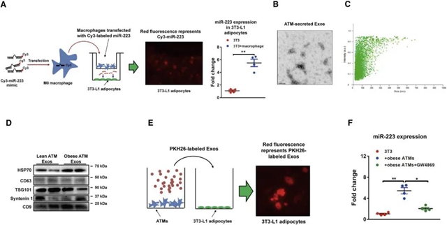 1、脂肪组织巨噬细胞(ATM)分泌的外泌体(Exos)将miRNA转移至胰岛素靶细胞