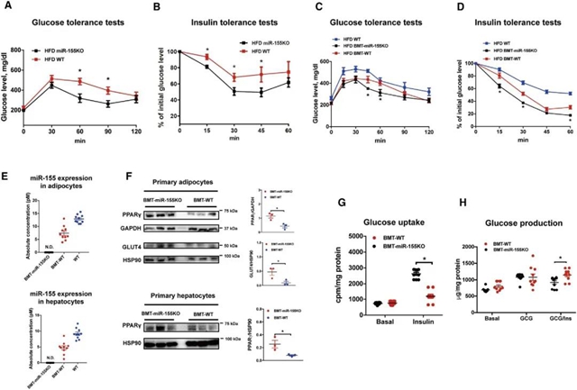 图 7. miR-155KO小鼠WT骨髓移植促进肥胖诱导的胰岛素抵抗