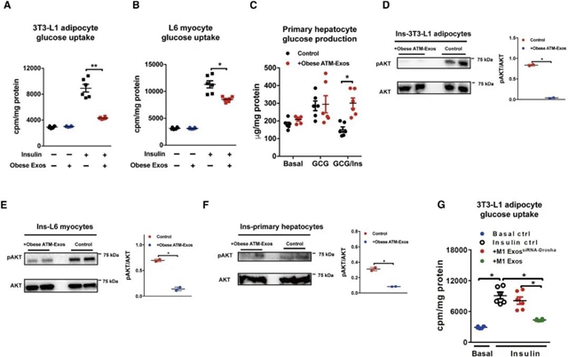 科研人员同时对相关的胰岛素靶细胞:脂肪细胞、肌细胞和肝细胞进行了研究。研究发现,肥胖ATM-Exos处理降低3T3-L1脂肪细胞和L6肌细胞的葡萄糖摄取能力,肥胖ATM-Exos阻断肝细胞胰岛素抑制胰高血糖素刺激的肝葡萄糖产生(Fig.3a-c)。肥胖ATM-Exos处理降低了三种胰岛素靶细胞的胰岛素诱导的AKT磷酸化激活(Fig.3d-f)。分别利用对照巨噬细胞外泌体或Drosha敲低的巨噬细胞外泌体对3T3-L1细胞,发现M1巨噬细胞抑制胰岛素刺激的葡萄糖摄取,miRNA减少的M1巨噬细胞则对胰岛素诱导的葡萄糖摄取没有影响(Fig.3g)。以上结果表明,miRNA是巨噬细胞分离的外泌体影响胰岛素靶细胞胰岛素敏感的关键物质。
