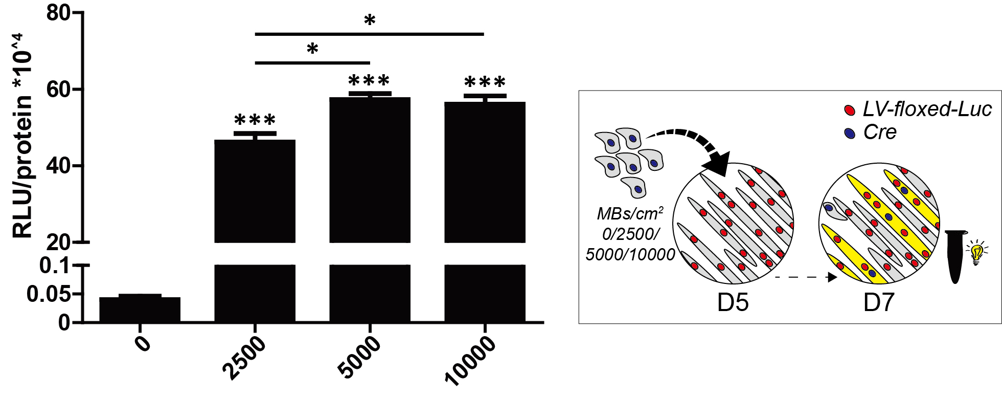 利用LV介导的Cre体系整合至基因组的特性,可以实现稳定细胞株的构建。荷兰马斯特里赫特大学医学中心Anita Kneppers研究团队【2】,利用LV病毒载体构建了一种基于Cre/ loxp的细胞融合报告体系,实现成肌细胞-肌管融合后荧光素酶的条件表达。