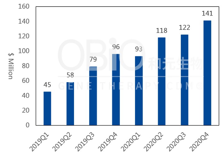 Yescarta是用于治疗复发或难治性弥漫性大 B 细胞淋巴瘤(DLBCL)的一款CD19 CAR-T疗法,单次治疗定价为37.3万美元。在Kymriah获批上市不久,2017年10月,FDA批准了Yescarta的上市申请,随后在2018年8月获得了EMA的批准上市,目前NMPA申请正在审批Yescarta在中国的上市申请。相较于Kymriah,Yescarta全球销售总额略高,2019年全年销售额为4.53亿美元,2020年全年销售额为563万美元,增幅24%,在2020Q2之后,单季度销售额略有下降。