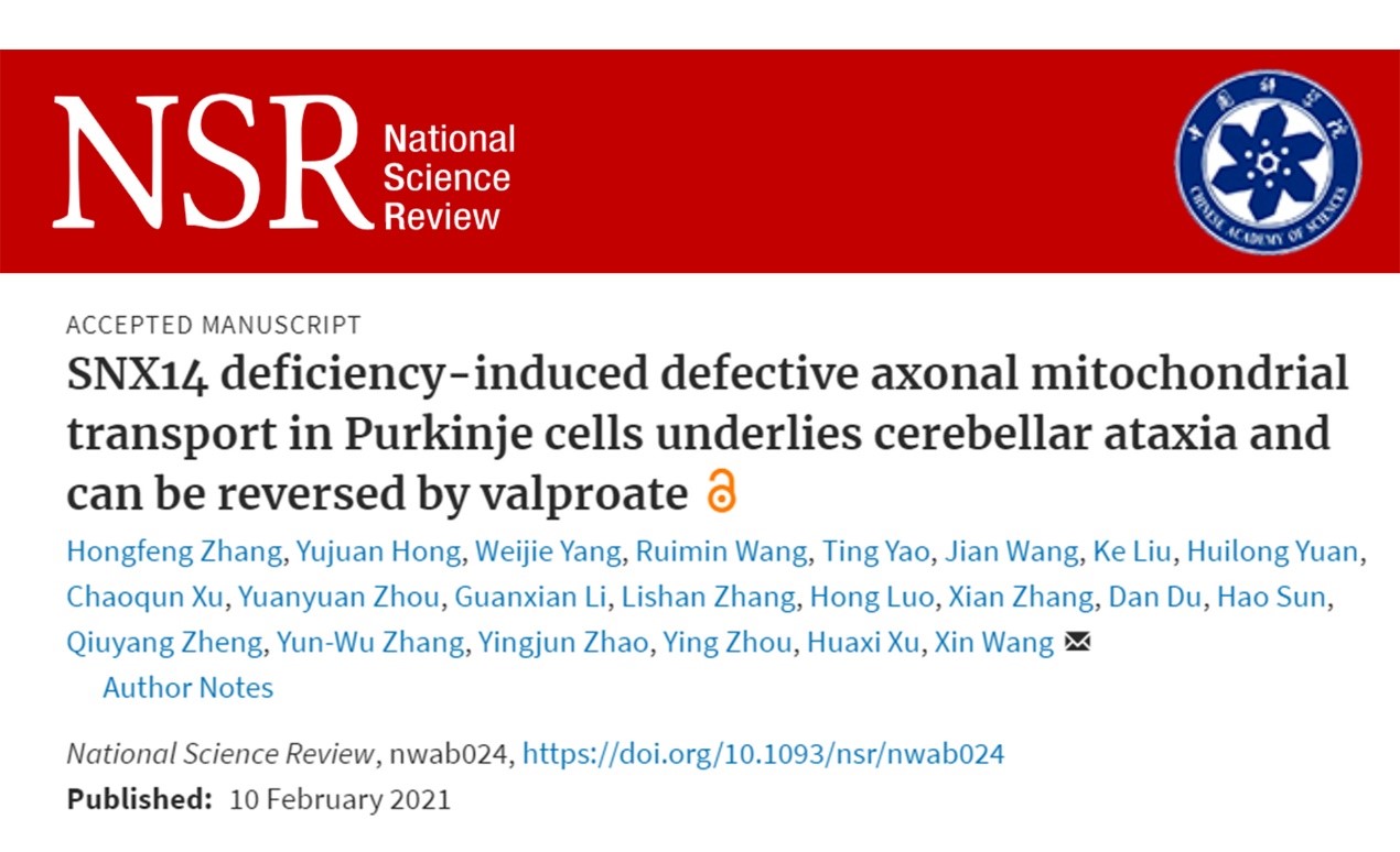 3. Zhang HF, et al. SNX14 deficiency-induced defective axonal mitochondrial transport in Purkinje cells underlies cerebellar ataxia and can be reversed by valproate. NSR. doi:10.1093/nsr/nwab024.