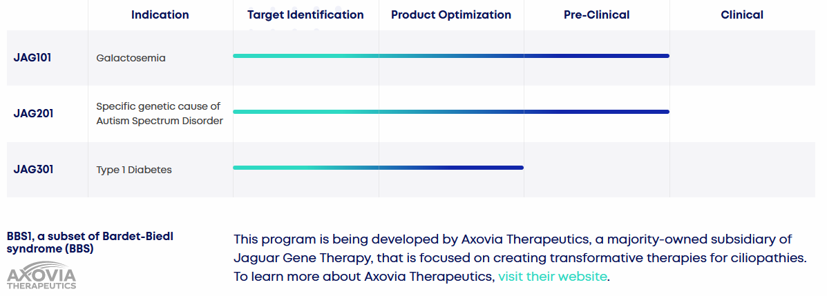 据Jaguar Gene Thearpy官网披露,目前该公司正在重点推进以下基于AAV9的基因治疗临床前管线: