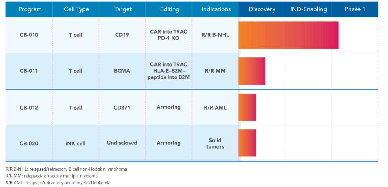 目前Caribou Biosciences有几款正在研发中的产品,其中进展最快的CB-010正在进行I期临床试验评估,是一种靶向CD19的CAR-T细胞疗法,针对患有复发性/难治性B细胞非霍奇金淋巴瘤的患者,这也是第一个进入临床阶段的“现货型”CAR-T细胞产品,同时,其基因组中的PD-1通过基因编辑被破坏,在临床前研究中展现出更持久的抗肿瘤活性。